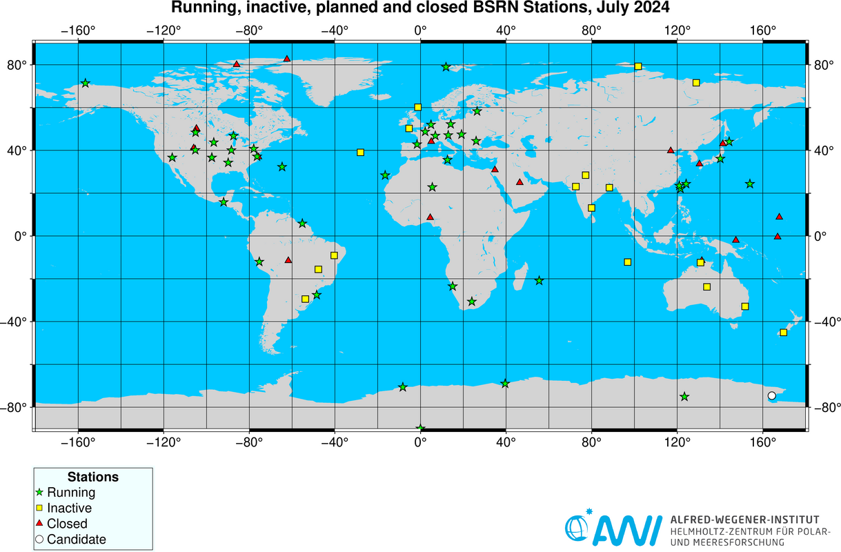 全世界約60地点の観測点で観測が行われており、BSRNにおいて観測されたデータは、世界放射モニタリングセンター(ドイツ,アルフレッド・ウェゲナー極地海洋研究所(AWI))によって無償で提供されています。 また、BSRNでは、放射測定における新技術の開発などを行っており、WMO測器観測法委員会(CIMO)における放射測定技術の発展に対して先導的役割を担っています。