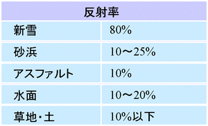 地表面での紫外線の反射の割合は、地表面の状態により下表の様に大きく異なります。草地やアスファルトの反射率は10%もしくはそれ以下ですが、砂浜では25%、新雪では80%にも達します。さらに、地表面で反射された紫外線の一部は上空に向かい、大気等で再び散乱されて地上に向かいます。つまり地表面の反射率が大きいところでは、反射率が小さいところより散乱光も強くなっています。例えば、南極のように一面雪原の場合には、上空からの紫外線量(UVインデックス)は、反射と散乱の効果により雪がないと仮定した場合と比較して4~5割ほど増加することが分かっています。