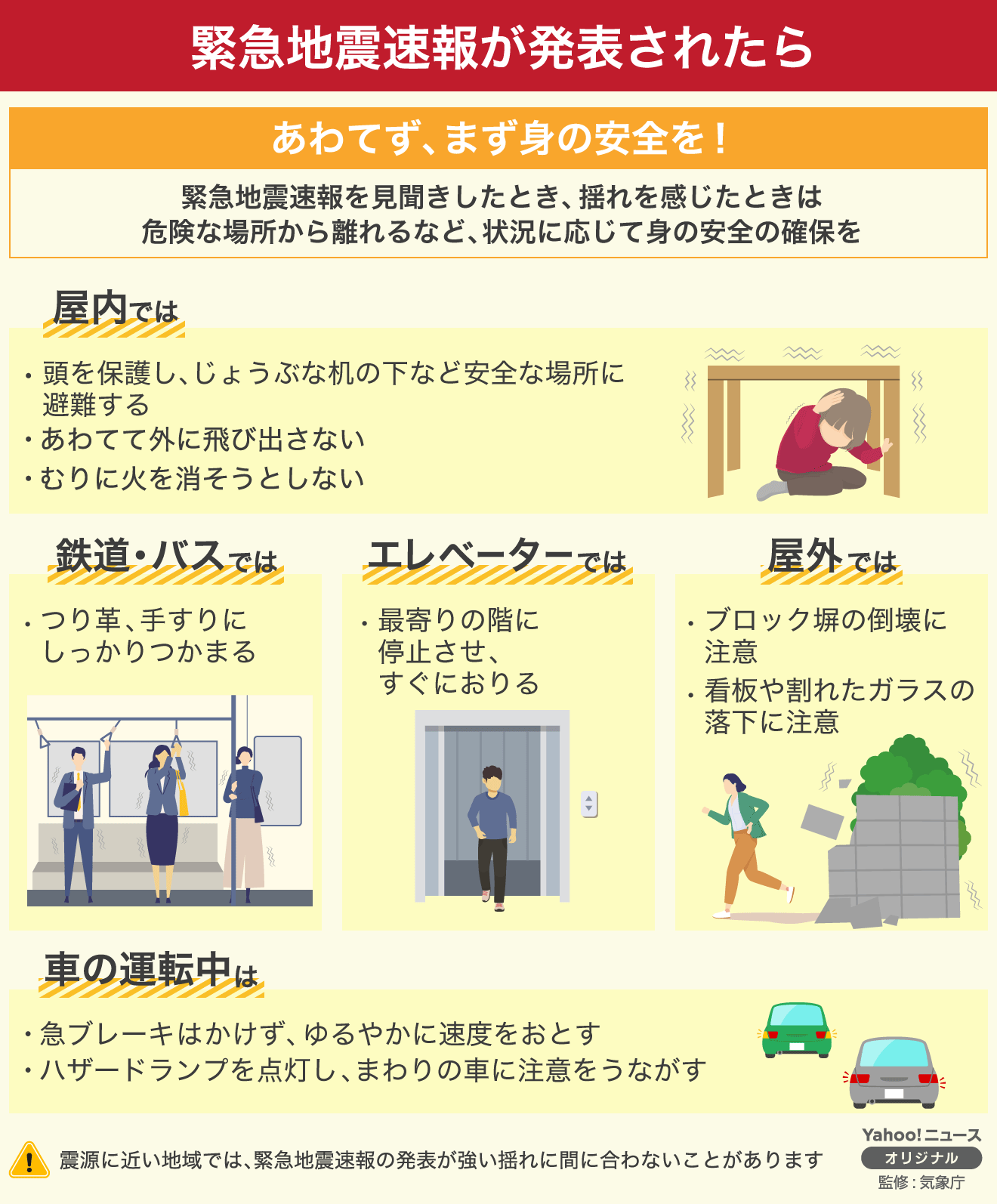 緊急地震速報を見聞きしたときの行動は、まわりの人に声をかけながら「周囲の状況に応じて、あわてずに、まず身の安全を確保する」ことが基本です。