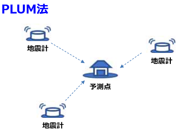 PLUM法(※)は、巨大地震が発生した際でも精度良く震度が求められる予測手法であり、震源や規模の推定は行わず、地震計で観測された揺れの強さから震度を予測します。