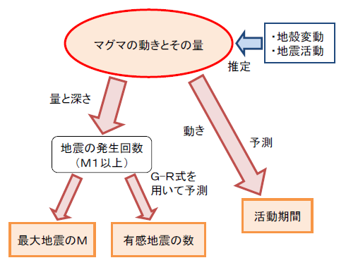 マグマの貫入の程度を表す地殻変動の大きさから、いくつかの段階を経て、 マグニチュード(M)1以上の地震の発生回数、最大地震の規模(M)、 伊東市で震度1以上を観測する地震の回数、及び活動期間の長さといった 地震活動の規模を予測します。