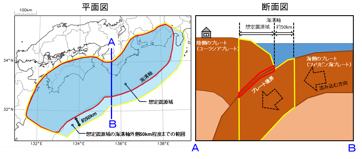 想定震源域内(科学的に想定される最大規模の南海トラフ地震の想定震源域(中央防災会議、2013))のプレート境界部(図中赤枠部)と監視領域(想定震源域内および想定震源域の海溝軸外側50km程度:図中黄枠部)