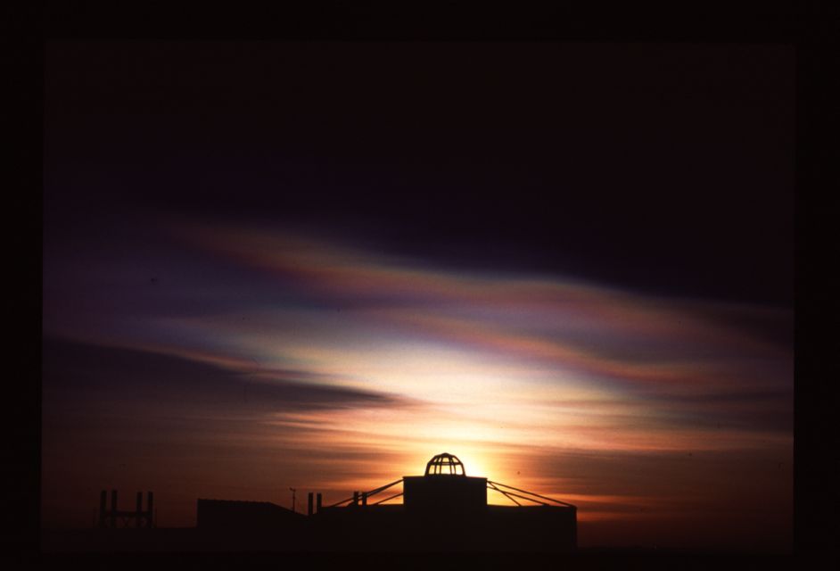写真のとおり太陽光を受けて極彩色に輝く雲ですが、この雲がオゾン層の破壊に寄与していることが分かっています。このような雲も観測対象として、現れた高度や方向、時間を日原簿の記事欄に記録しています。