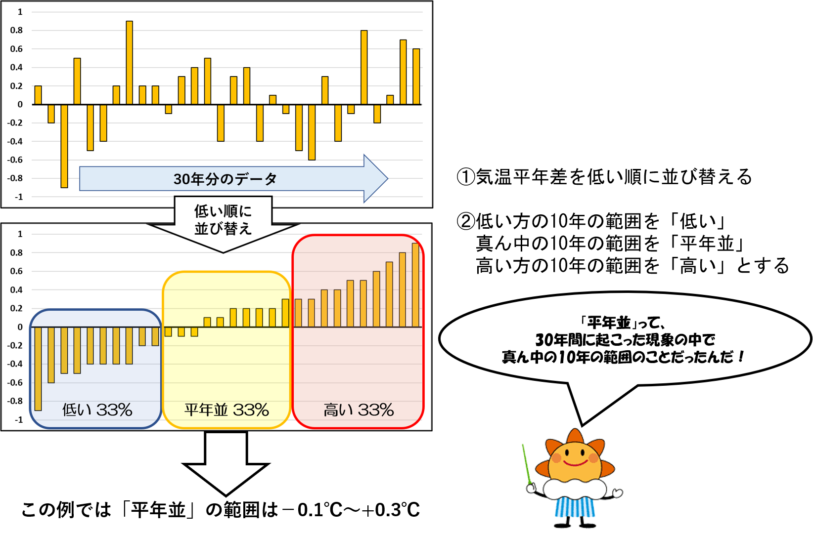 この「低い(少ない)」、「平年並」、「高い(多い)」といった3つの階級は、1991年~2020年の30年間の値のうち、11番目から20番目までの範囲を「平年並」として、それより低ければ「低い」、高ければ「高い」と定めています。このように3つの階級を定めることで、過去30年間の値では3つの階級それぞれの出現回数が10回ずつとなり、出現率が等分(33%ずつ)となります。これを気候的出現率といいます。