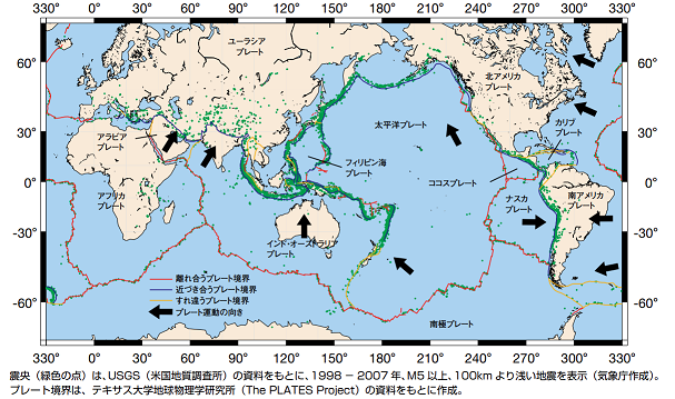 地震や火山活動の原因は、地球の表面を覆っているプレートの運動と深い関係があります。プレートの運動から、地震や火山活動など地球上の多くの現象を統一的に説明する考え方が「プレートテクトニクス」です。
