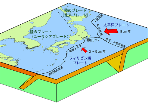 日本周辺では、海のプレートである太平洋プレート、フィリピン海プレートが、陸のプレート (北米プレートやユーラシアプレート)の方へ1年あたり数cmの速度で動いており、陸のプレートの下に沈み込んでいます。具体的には、太平洋プレートが千島海溝、日本海溝、伊豆・小笠原海溝から、フィリピン海プレートが相模トラフ、南海トラフ、南西諸島海溝から日本列島の下に沈み込んでいます。このように、日本周辺では複数のプレートによって複雑な力がかかっており、世界でも有数の地震多発地帯となっています。