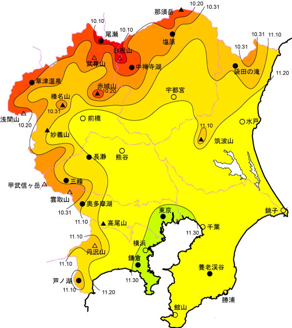 紅葉は気温が低いと早まり、気温が高いと遅くなります。